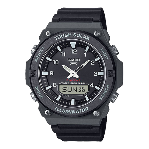 10気圧防水仕様を備えたソーラーウオッチです。航空計器をモチーフに、ベゼルはフラットに仕上げたラウンド形状、インデックス・針には視認しやすいホワイトカラーを採用しました。6時位置には日付や曜日、ワールドタイムを表示する便利な液晶が付いています。