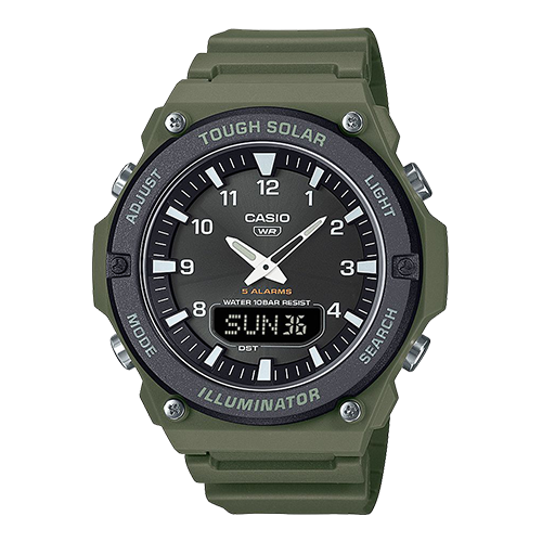 10気圧防水仕様を備えたソーラーウオッチです。航空計器をモチーフに、ベゼルはフラットに仕上げたラウンド形状、インデックス・針には視認しやすいホワイトカラーを採用しました。6時位置には日付や曜日、ワールドタイムを表示する便利な液晶が付いています。