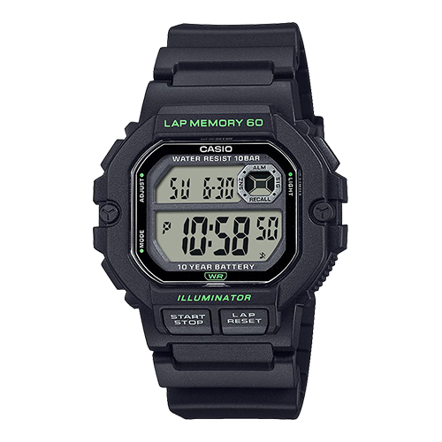 ヘビーデューティな角型ケースに、ランニング中でも視認し易いデジタル表示、ストップウオッチ計測に便利なフロントボタンを採用。突然の雨や水濡れを気にせず使える10気圧防水、暗闇でも安心のLEDライト、電池寿命約10年等、ワークアウトに役立つ機能を搭載しました。