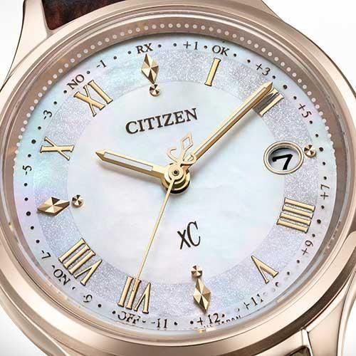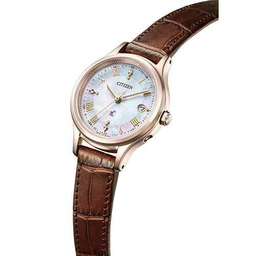 「hikari collection」のポイントであるベゼル、差し込む光をイメージしたカットパーツなどの要素はそのままに、文字板には白蝶貝を採用。上品でさりげない輝きが手元を彩ります。型押しを施した牛革のバンドが、手元を大人っぽく引き締めます。