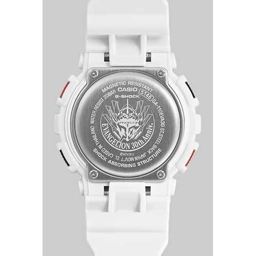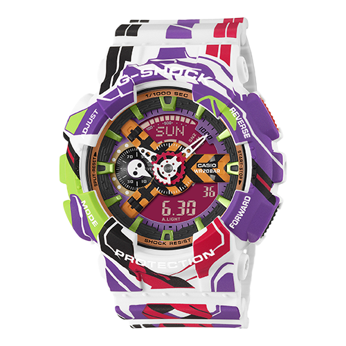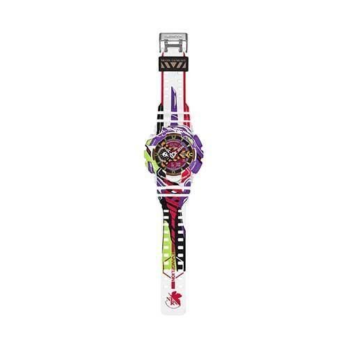 G-SHOCK全体にエヴァンゲリオン初号機が描かれ、12時側のバンドには初号機の頭部装備である角、ベゼル部分には初号機の顔、ベゼル下部から6時側のバンドにかけてはロンギヌスの槍を投擲しようとする左腕がデザインされています。