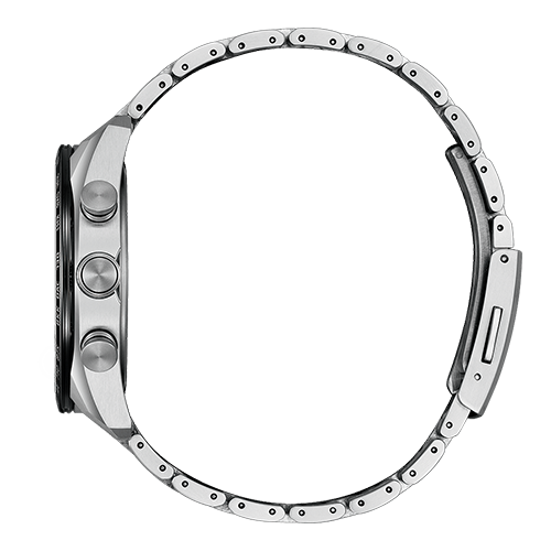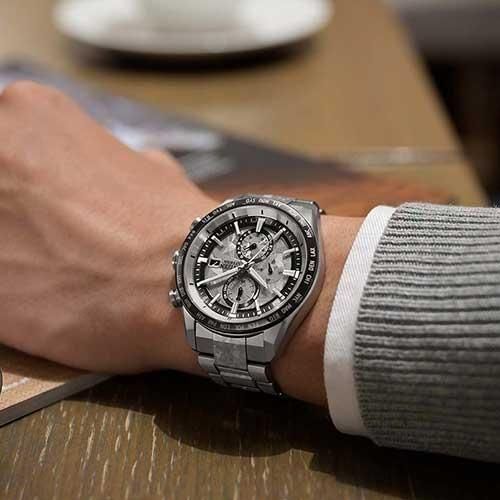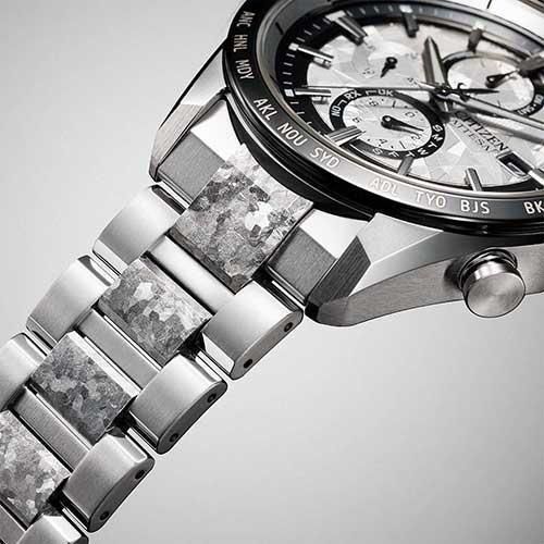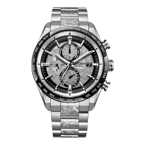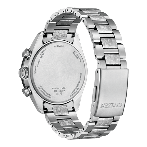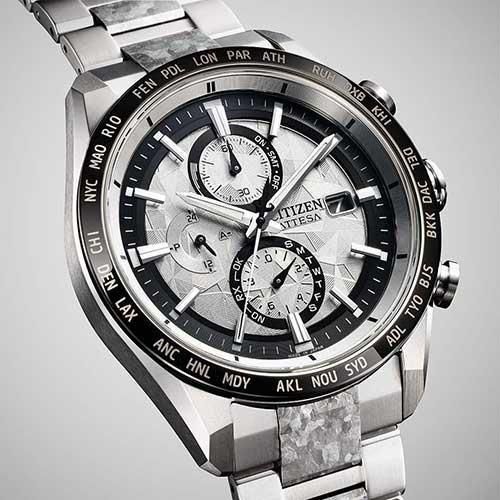 シチズン独自の技術で開発した結晶チタニウムを中駒に採用。デュラテクトプラチナを重ねることで結晶模様がプラチナの輝きをまとい、存在感を放ちます。シルバーの文字板は、結晶チタニウムをイメージしたデザインで、光に反射して表情を変えるメタリック塗装をプラス。見返しリングにも同様にメタリック塗装を施すことで、文字板や外装との一体感を演出しました。