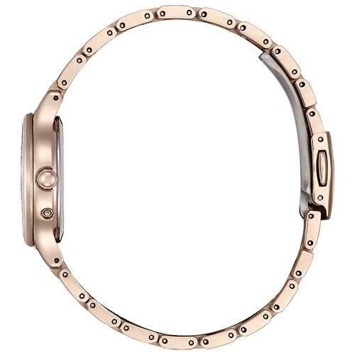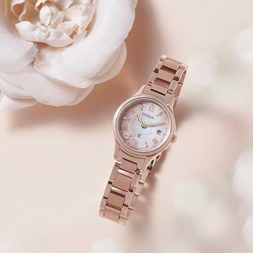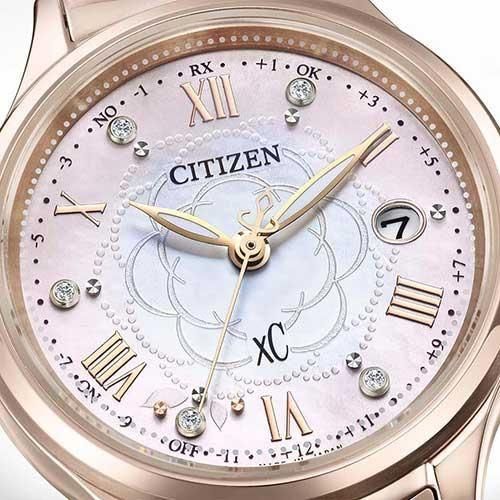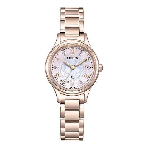 満開の美しいカメリア(椿)をモチーフにデザインした白蝶貝の文字板には、エッチングの花模様と“光の粒”が花びらに乗っているかのようなドットパターンを組み合わせ、愛らしさを表現しています。外周のピンクのグラデーションが、カメリアの華やかさと可愛らしさを引き立てています。
