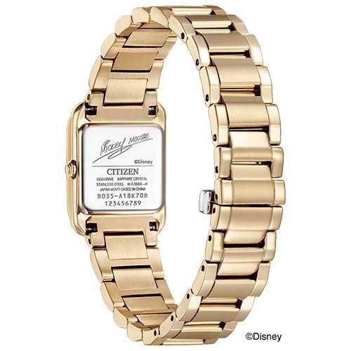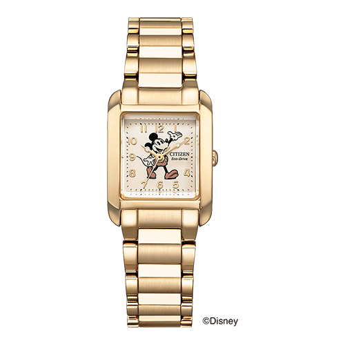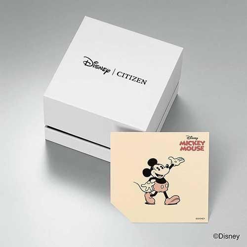 文字板の中央に「ミッキーマウス」を描いた限定モデル。ウォームゴールドのケースとバンドに、ピンクベージュの文字板を組み合わせ、クラシカルな雰囲気を演出。インデックスはアラビア数字、針には白樹脂をプラスし、視認性にも考慮したデザインに仕上げています。裏ぶたに「ミッキーマウス」のサインを刻印した限定仕様です。