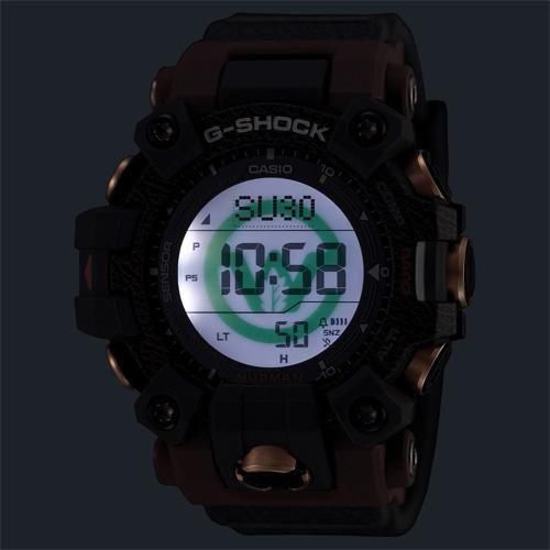 機能面では、防塵・防泥構造に加え、方位・気圧/高度・温度を計測できるトリプルセンサー を搭載し、サバイバルシーンでの実用性は抜群です。さらに、ボタン部分にはカバをイメージしたローズゴールドIPをあしらい、無骨さの中に高級感あるアクセントをプラス。バックライトにはEARTHWATCHのロゴが浮かび上がり、裏蓋には「Love The Sea And The Earth」のシンボルマークが刻印されています。
