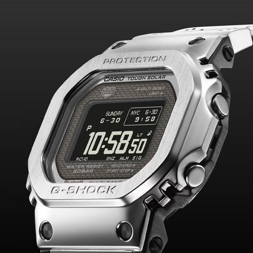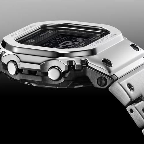 ベゼルとセンターケースを上下で連結した構造を開発。ケースサイドから見える造形が構造の美しさを強調。フルメタルながらG-SHOCKの耐衝撃基準をクリアし、気密性に優れたスクリューバックケースも採用しています。