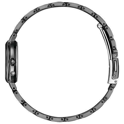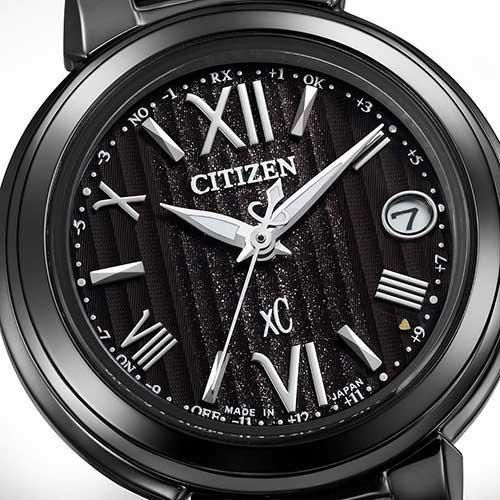 クールな印象のブラックカラーケースに、文字板にはストライプパターンにラメを散りばめた華やかなデザインがポイントです。