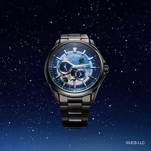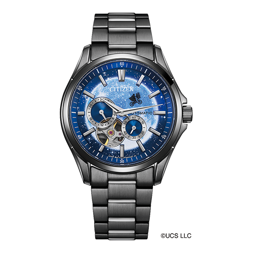 主人公「エリオット」が⾃転⾞のかごに「E.T.」を乗せて、満⽉の夜空を翔ける名シーンを表現した限定モデル。ダークグレーのケースとブルーの文字板を合わせたスタイリッシュな配色に、深いブルーの見返しリングが夜空のイメージをきわだたせます。ギフトにもぴったりなロゴ入りの限定ボックスと文字板と同じシーンを描いた限定カード付き。